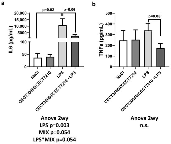 Plasma concentrations of proinflammatory cytokines interleukin 6 (IL-6) (a) and tumor necrosis factor alpha (TNF-α) (b) after treatments. n.s.: non-significant. “*” in “LPS*MIX” means interaction. n = 10/group.