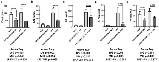 Myometrium concentrations of proinflammatory cytokines after treatments: interferon gamma (IFN-g) (a); interleukin 1 beta (IL1-b) (b); interleukin 6 (IL-6) (c); interleukin 17 α (IL-17a) (d); and tumor necrosis factor alpha (TNF-α) (e). “*” in “LPS*MIX” means interaction. n = 10/group.