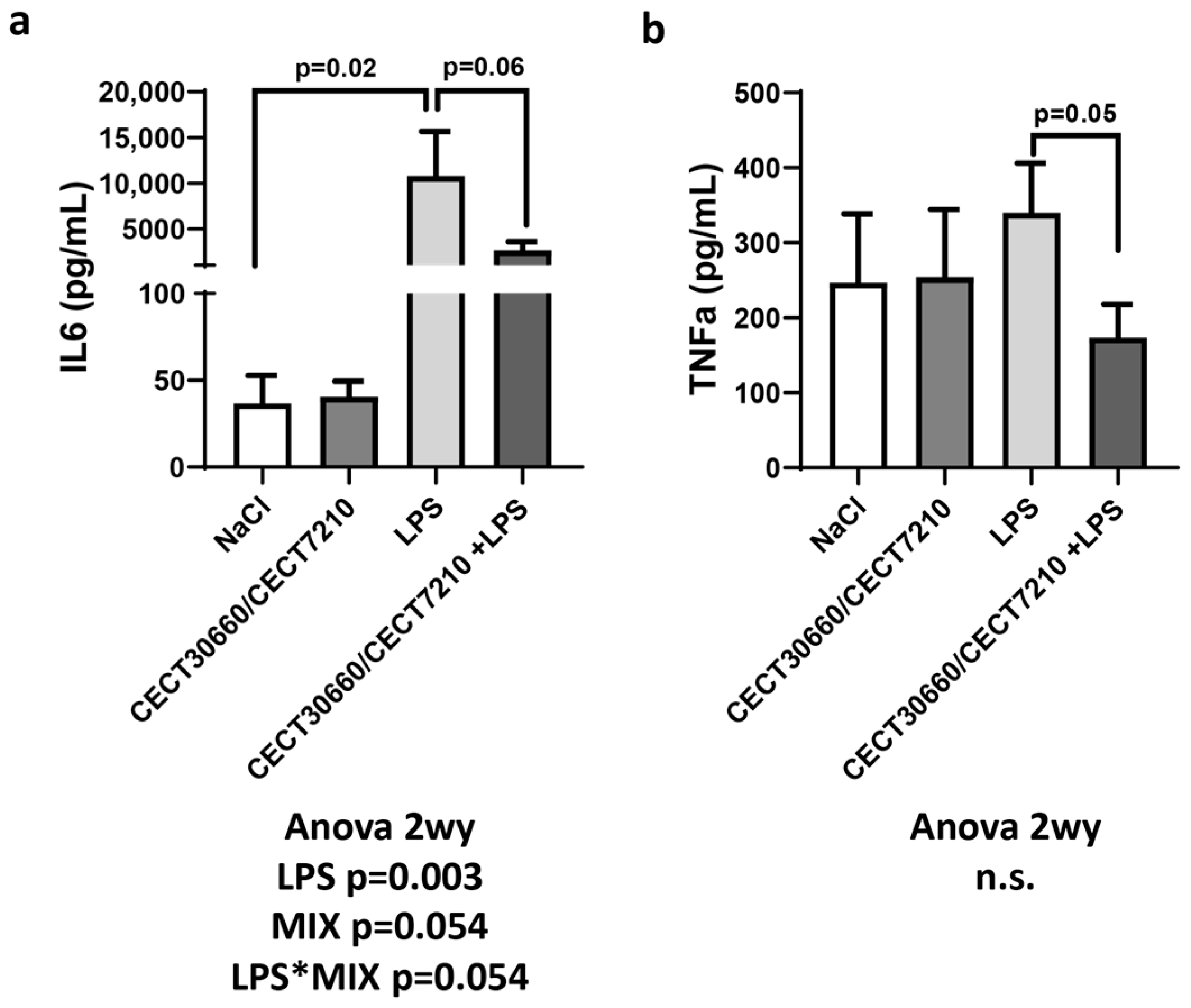 3.3. The Combination of CECT 7210 and CECT 30660 Cell-Free Supernatants Attenuated LPS-Induced Cytokine Levels