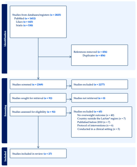 The literature search yielded 2825 publications across the selected databases (Figure 1). After removal of duplicates and screening of titles and abstracts, 92 articles remained. Full-text review and application of the eligibility criteria resulted in the exclusion of 65 articles: 40 that did not report overweight-related outcomes, seven describing school-based programs conducted outside of LatAm, seven published outside the specified time frame, six that were intervention protocols only, and five conducted in clinical settings. Ultimately, 27 studies met the inclusion criteria and were included in the review.