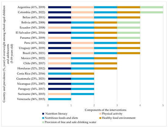Table S1 presents school-based policies and programs currently implemented in the LatAm region. Figure 2 shows that while most countries lack comprehensive, multi-component strategies to prevent overweight, 19 countries have adopted at least one of the evidence-based components. Five countries have implemented two components. Guatemala, Nicaragua, and Panama have adopted nutrition literacy alongside the nutritious foods and diets. Suriname has focused on physical activity and nutritious foods and diets. Costa Rica has implemented nutritious foods and diets and introduced the healthy food environment. Three countries have incorporated three components. Chile and Mexico have implemented the physical activity, nutritious foods and diets, and a healthy food environment. In contrast, Honduras has implemented nutrition literacy, nutritious foods and diets, and the healthy food environment. Eight countries (Belize, Bolivia, Brazil, Ecuador, El Salvador, Panama, Peru, and Uruguay) have implemented four components, among these, the nutritious foods and diets and implementation of a healthy food environment were consistently included.
