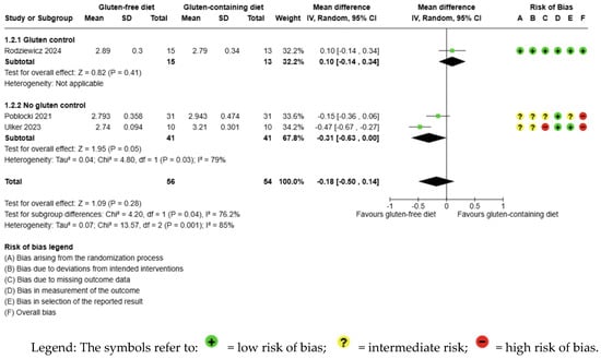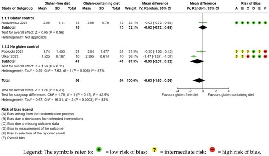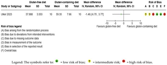 The body weight outcome was not meta-analyzed as it was collected in an individual study [56] (Figure 8, Supplementary Material—Table S6). The evidence is very uncertain about the effect of GFD on body weight levels compared to the control group (MD −1.46 kg; 95% CI −6.70 to 3.77) (Figure 8); this one study had 20 participants (Figure 8, Supplementary Material—Table S6); the certainty of the evidence was very low. We downgraded the certainty of the evidence due to serious methodological concerns due to extremely serious imprecision; the CI ranges from a large beneficial effect to a moderate harmful effect (SMD −0.23 kg, 95% CI −1.11, 0.65) (Supplementary Material—Table S6).
