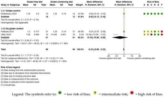 The CRP outcome was not meta-analyzed as it was collected in an individual study [65] (Figure 7, Supplementary Material—Table S6). The evidence is very uncertain about the effect of GFD on CRP levels considering the comparison with the control group (MD −0.12 IU/mL; 95% CI −0.30 to 0.07); the unique study had 28 participants (Figure 7, Supplementary material—Table S6), and the certainty of the evidence was very low. We downgraded the certainty of the evidence to being of serious methodological concern due to extremely serious imprecision; the CI ranges from a large beneficial effect to a small harmful effect (SMD −0.49 IU/mL, 95% CI −1.25, 0.26) (Supplementary Material—Table S6).