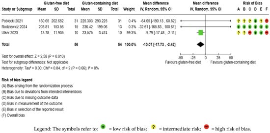 GFD decreased anti-Tg levels significantly compared to the control, but the evidence is very uncertain (MD −10.07 IU/mL; 95% CI −17.73 to −2.42; p = 0.010); three studies had 110 participants (Figure 5), and the certainty of the evidence was very low. We downgraded the certainty of the evidence due to serious methodological concerns (two studies presented a high overall risk of bias) and due to extremely serious imprecision; the CI ranges from a large beneficial effect to a trivial effect or no effect (SMD −0.39 IU/mL, 95% CI −0.84, 0.06) (Supplementary Material—Table S6). Moreover, no significant heterogeneity was observed among the included studies (I2 = 0%, p < 0.66) (Figure 5).