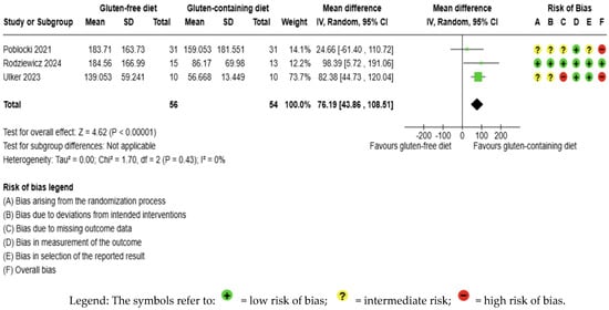According to the narrative results, Table 2 shows that the mean age ranged from 34.6 to 43.25 years. Three studies were conducted on women, and only one RCT was conducted on both sexes [18]; the intervention period in the included trials ranged from 1 month to 3 months. The gluten-free diet group received a sample GFD menu or weekly diet according to individual requirements, and the control group did not undergo any modification. Only in one study [65] was there an intervention with the use of capsules for both the gluten-free group (rice starch) and the control group (2 g/day of gluten). Two studies [18,56] had more arms, but data was only extracted from nutritional interventions according to the PICOS: the GFD and control groups [56]. In the trial of Rodziewicz et al., [65], the diets differed; we changed the intervention to the control to better understand the table and meta-analysis standardization. Only one study reported adverse effects [65], as shown in Supplementary Material Table S5.