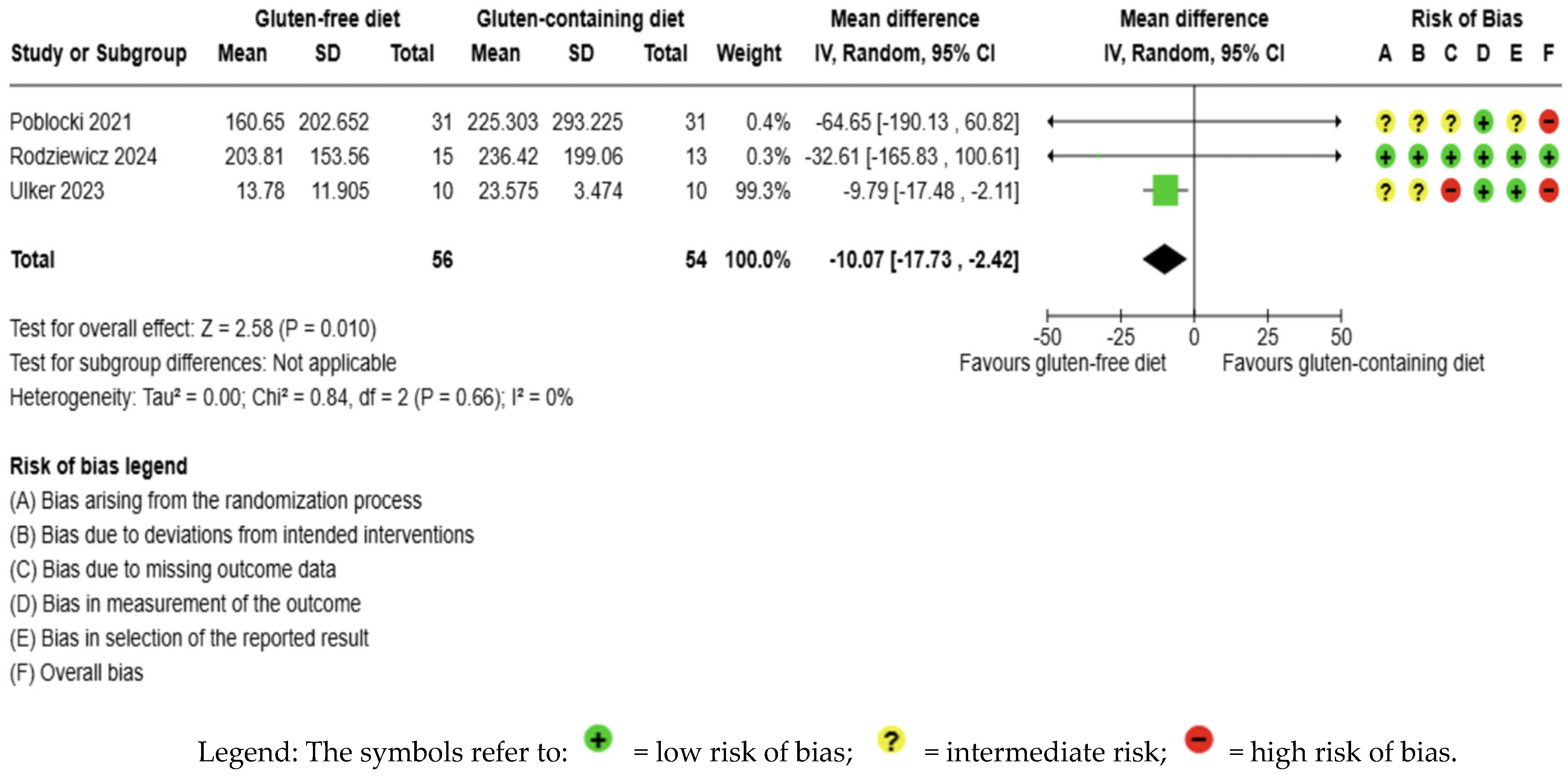 | No Information | Lagana M; Piticchio T; et al. [18] | 2025 | Italy | 30 (20F; 10M) | RCT, single-blind study | Men/women | 43.25 * (11.858 **) GFD; 42.25 * (12.434 **) FD (GG). | No diagnosis nor symptoms of CD | 3 | Patients received information according to individual recommendation by a registered dietitian. | No change in the subjects’ dietary habits. | TSH, T4, anti-TPO, anti-Tg. | No conflict |