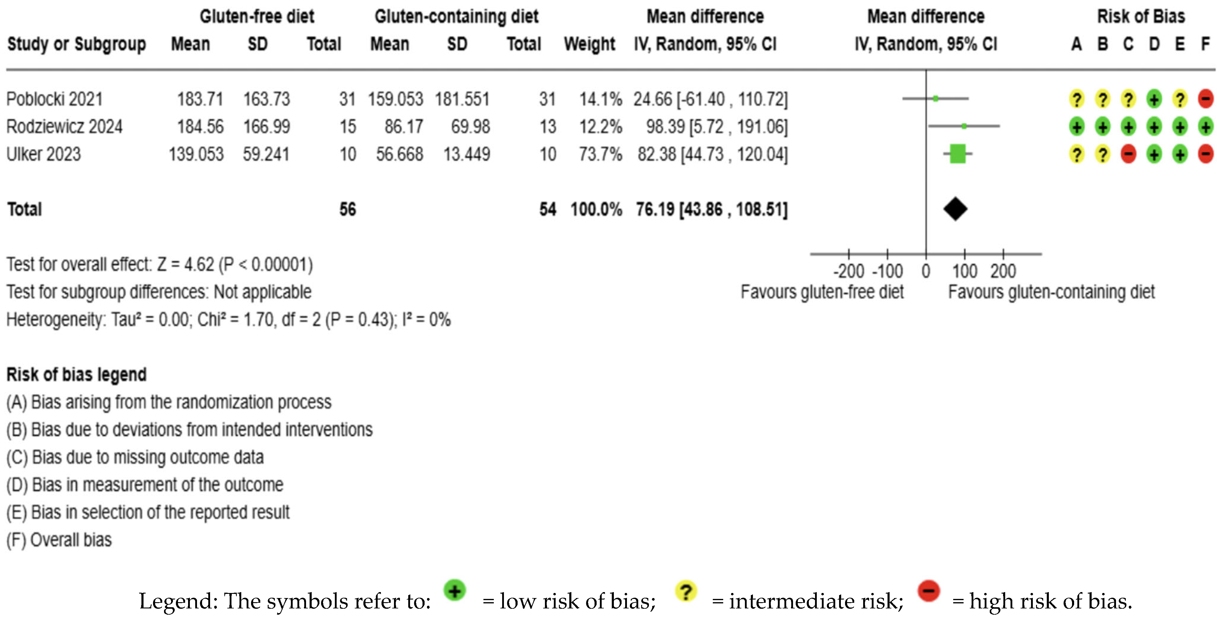 | No Information | Poblocki J, et al. [59] | 2021 | Poland | 62 | RCT | Women | 36.64 (33.66–39.63) GFD; 37.07 (33.83–40.31) CG | Patient was tested for CD: IgA-class antibodies against tTg and total IgA. If necessary: gastroscopy and duodenal biopsy | 3 | All participants received a sample GFD menu (≤20 mg of gluten per 1 kg natural and processed products) | Did not undergo any modification. They consumed gluten before and during the study. | TSH, T3, T4, anti-TPO, anti-Tg, body weight, BMI | No conflict |