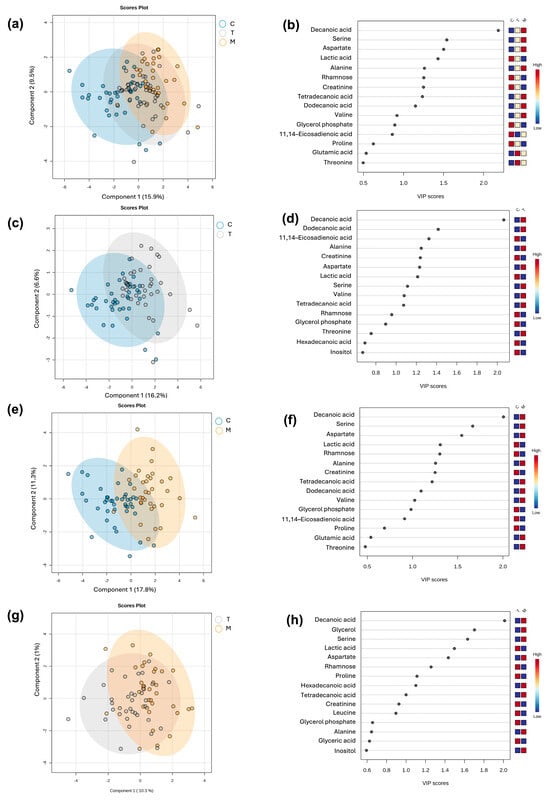 Partial least squares-discriminate analysis (PLS-DA) plots of differential metabolites per milk stage and their corresponding VIP values. C vs. T vs. M (a,b); C vs. T (c,d); C vs. M (e,f); T vs. M (g,h). C: colostrum; T: transition milk; M: mature milk.