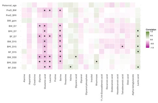 Spearman’s correlation analysis between the identified metabolites and the maternal age and anthropometric variable. * denote the moderate correlations found, with p < 0.05. PreG_BW: Pregestational Body Weight; PreG_BMI: Pregestational Body Mass Index; BW_gain: Body weight gain during pregnancy; BW_D7: Body weight at day 7 postpartum; BMI_D7: Body Mass Index at day 7 postpartum; BF_D7: Body Fat % at day 7 postpartum; BW_D15: Body weight at day 15 postpartum; BMI_D15: Body Mass Index at day 15 postpartum; BF_D15: Body Fat % at day 15 postpartum; BW_D30: Body weight at day 30 postpartum; BMI_D30: Body Mass Index at day 30 postpartum; BF_D30: Body Fat % at day 30 postpartum.