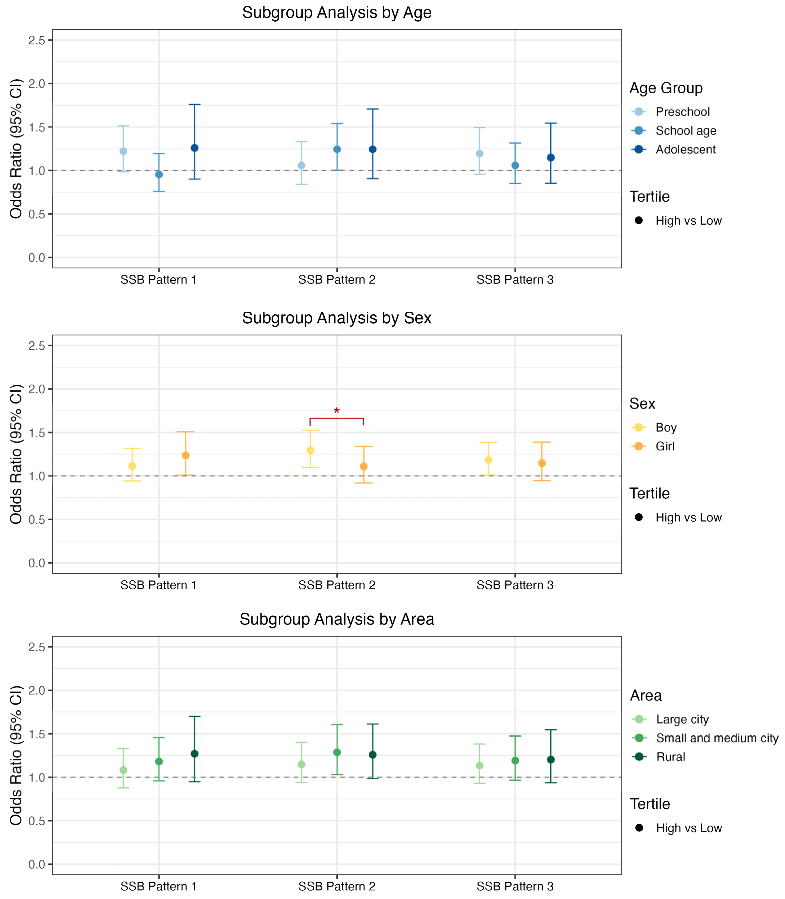 3.4. Subgroup Analysis of SSB Consumption Patterns and Childhood Overweight/Obesity Across Different Age, Sex, and Area
