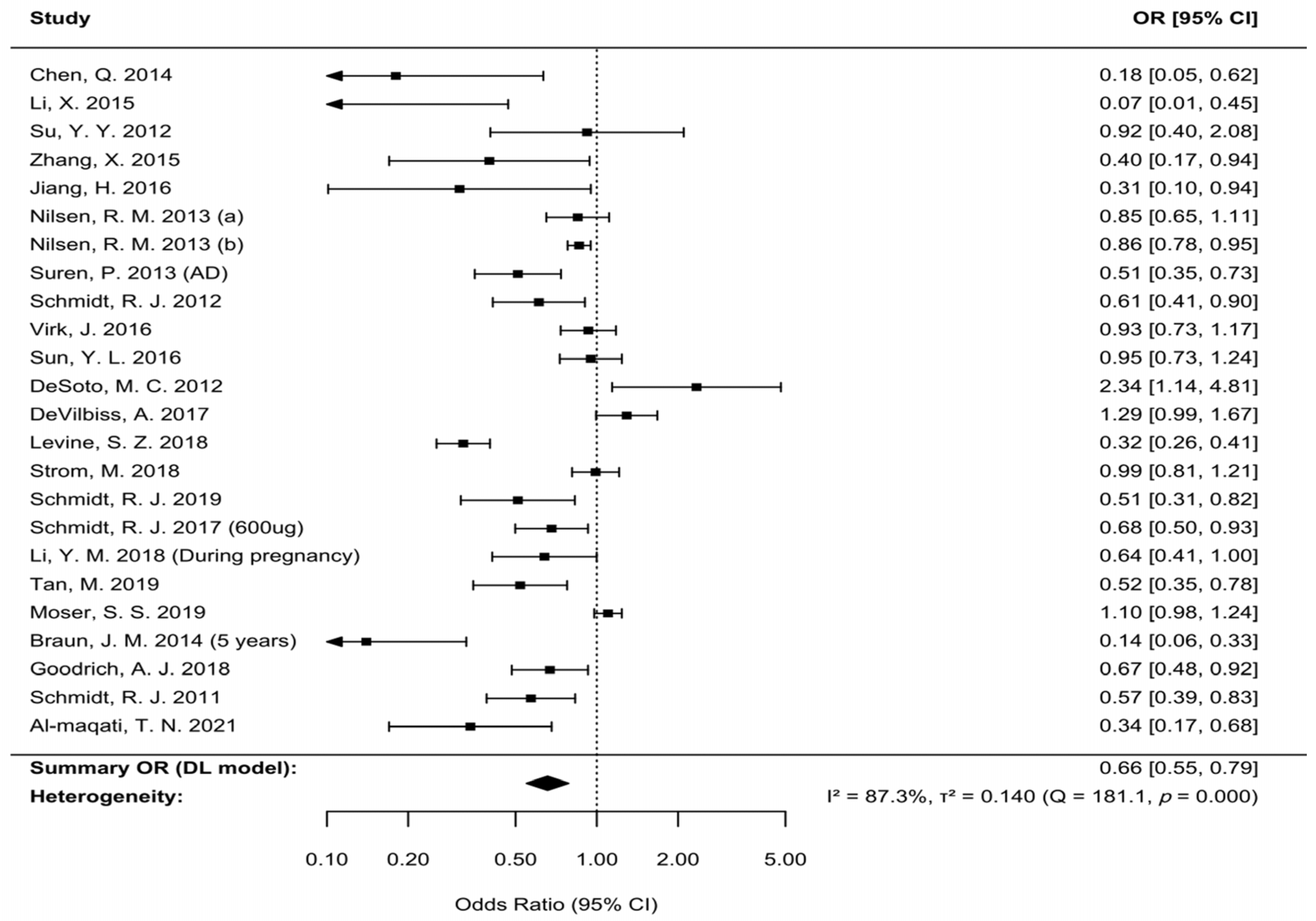 | Chen et al. [12] | NA | Before pregnancy, early pregnancy, pregnancy | No use, the lowest dose, below the recommended dose, or the shortest period | CABS, DSM-IV, ICD-10/9, ADI-R, ADOS, ABC, etc. | About: 16 Cohort studies: 8 Case–control studies: 8 | 360,282 (NA) | MEDLINE, Web of Science, Cochrane Library, Scopus, EMBASE, and PsychInfo (until 24 September 2021) | China, Sweden, Israel, Norway, the United States, Denmark, Saudi Arabia | Case–control studies: random effects model/OR = 0.670 (0.430–1.050) Cohort studies: random effects model/OR = 0.690 (0.510–0.930) |