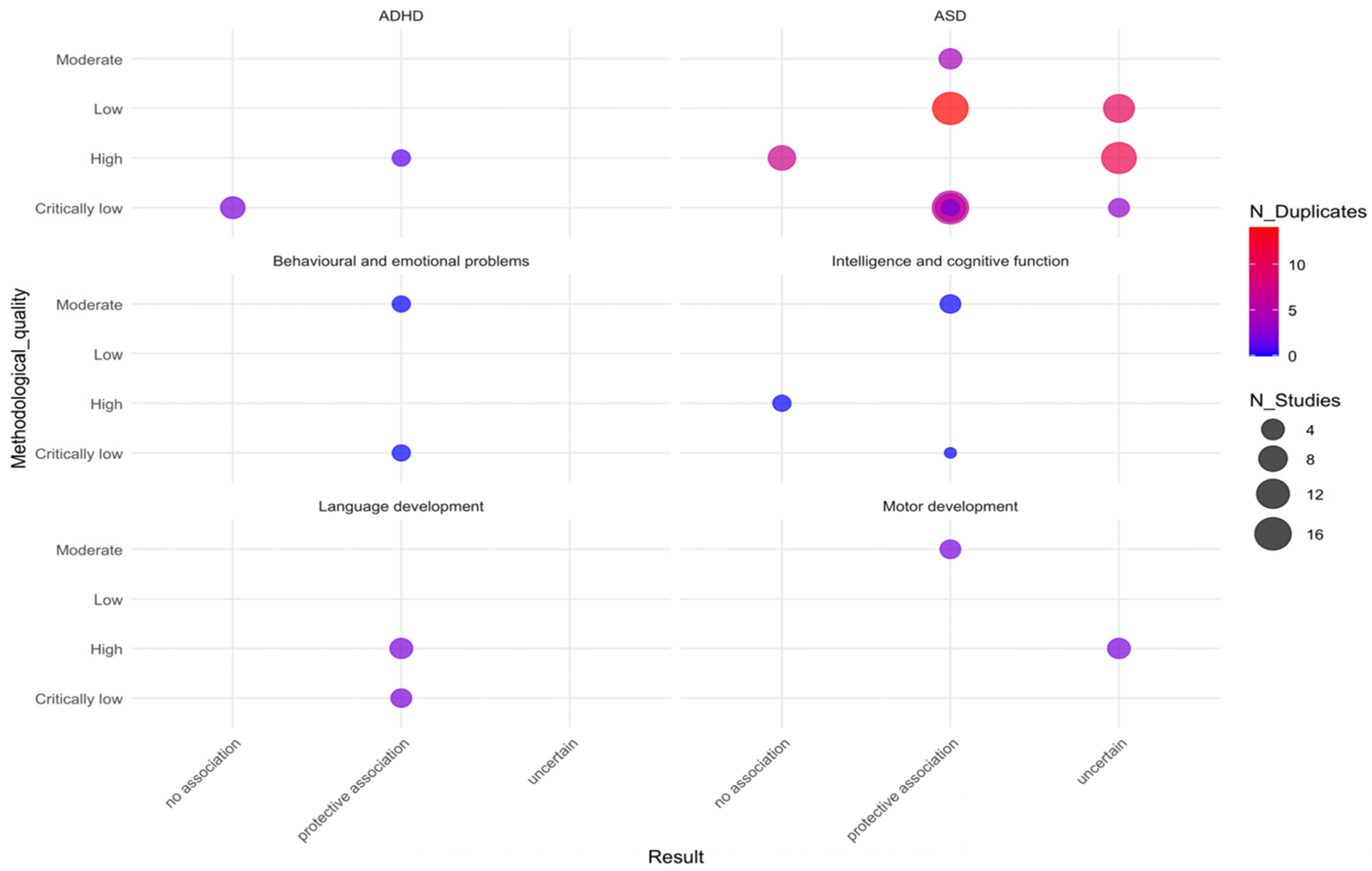 | Chen et al. [12] | NA | Before and/or during pregnancy | No use, the lowest dose, below the recommended dose, or the shortest period | Bayley test, CDIs, MCSA, etc. | About: 4 Cohort studies: 4 | 8408 (NA) | MEDLINE, Web of Science, Cochrane Library, Scopus, EMBASE, and PsychInfo (until 24 September 2021) | New Zealand, Poland, Spain | Random effects model/Beta = 0.780 (−1.170–2.720) |
