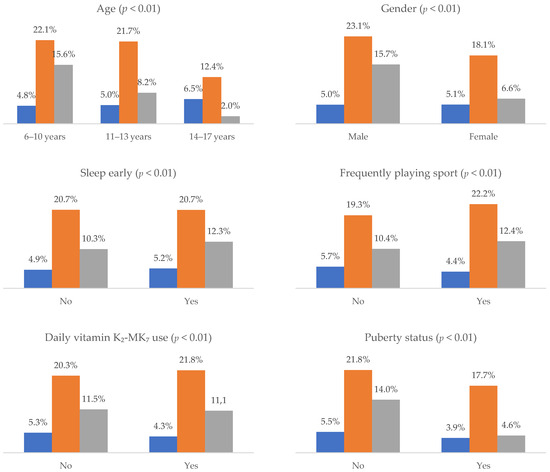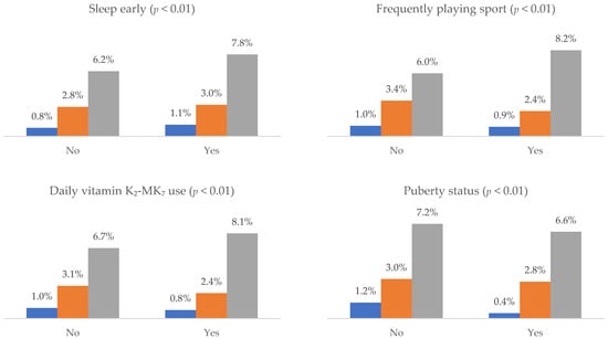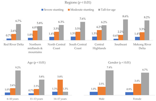 Figure 2 shows that severe stunting ranged 0.7–1.3% across age groups, with tall-for-age highest at 9.2% in 6–10 years and lowest at 1.3% in 14–17 years (p < 0.01). Males and females had similar normal height proportions (89.1%), with tall-for-age slightly higher in males (7.4%) (p < 0.01). By region, severe stunting was lowest in the Southeast (0.6%) and highest in the South Central Coast and Central Highlands (1.5%), while tall-for-age ranged 5.8–8.6% (p < 0.01). Sleeping early, frequent sports, and daily vitamin K2 use were associated with slightly higher tall-for-age and lower stunting (all p < 0.01). Severe stunting was higher in children not yet in puberty (1.2%) than in those already in puberty (0.4%) (p < 0.01) (see in Table S1).