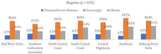 Figure 3 indicated that differences across subgroups were statistically significant (p < 0.001). Younger children (6–10 years) showed a higher proportion of overweight and obesity, while older adolescents (14–17 years) had a greater proportion of thinness and normal BMI. Boys exhibited higher rates of overweight and obesity compared to girls. Regional variations were evident, with the Southeast and Mekong River Delta showing higher proportions of overweight and obesity. Behavioral factors such as early sleep, frequent sports participation, daily vitamin K2–MK7 use, and puberty status were also associated with variation in BMI categories (see in Table S2).