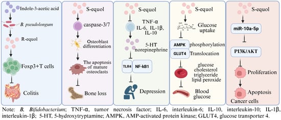 The potential physiological functions of Equol. Indole-3-acetic acid plays a role in alleviating intestinal inflammation by promoting the production of equol by Bifidobacterium pseudolongum in mice [19]; S-equol can inhibit osteoclast differentiation and stimulate apoptosis of mature osteoclasts via inducing caspase-3/7 activity in BMCs and RAW 264.7 cells [21]; S-equol can alleviate the depressive-like behavior and neuroinflammation induced by LPS via the TLR4/NF-κB signaling pathway in mice [20]; S-equol can lower the fasting blood sugar level and inhibit the gene expression of liver enzymes related to glucose metabolism in mice, showed a potential anti-diabetic roles [18]; S-equol showed an anti-breast cancer role via up-regulating miR-10a-5p and inhibiting the PI3K/AKT pathway [22]. This Figure was created in BioRender. (2025) https://BioRender.com/fgldagm (accessed on 25 August 2025).