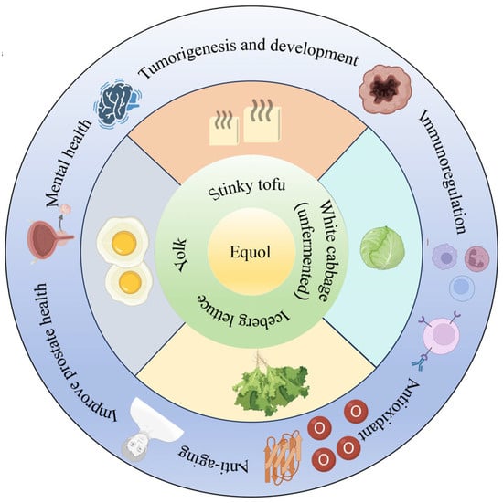 Numerous studies have demonstrated that humans have been exposed to equol-rich foods for a considerable period of time in history (Figure 2). Equol exists in fermented soy products, egg yolks [27], cabbage, and lettuce [28,29]; however, the low content in these foods limits equol’s impact on host physiological functions. People who are unable to produce endogenous equol require exogenous equol supplementation to meet their needs. Therefore, the rapid and efficient preparation of equol has become an important research topic.