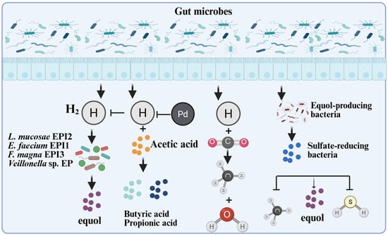 The interaction mechanism between microorganisms, gas, and equol. Hydrogen is an important by-product of anaerobic bacterial fermentation and is partially reused by specific intestinal microorganisms. For instance, methanogens can use H2 as an electron donor to reduce CO2, methanol, or acetic acid into methane gas [45,46]; the inhibitory effect of acetic acid on the production of equol may be due to the consumption of hydrogen by bacteria that produce propionic acid or butyric acid. H2 can stimulate equol production by the mixed culture [34]; the count of equol-producing bacteria is negatively correlated with the count of Clostridium coccoides-Eubacterium rectale, and positively correlated with the abundance of sulfate-reducing bacteria [6]; the equol-producing bacterium EPC4 also significantly reduces the generation of methane and hydrogen sulfide in the culture system [44]. This Figure was created in BioRender. (2025) https://BioRender.com/txlg2pd (accessed on 25 August 2025).