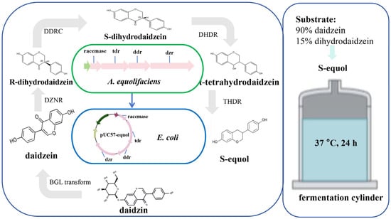 - Deng, H.; Gao, S.; Zhang, W.; Zhang, T.; Li, N.; Zhou, J. High titer of (S)-equol synthesis from daidzein in Escherichia coli. ACS Synth. Biol. 2022, 11, 4043–4053. [Google Scholar] [CrossRef]