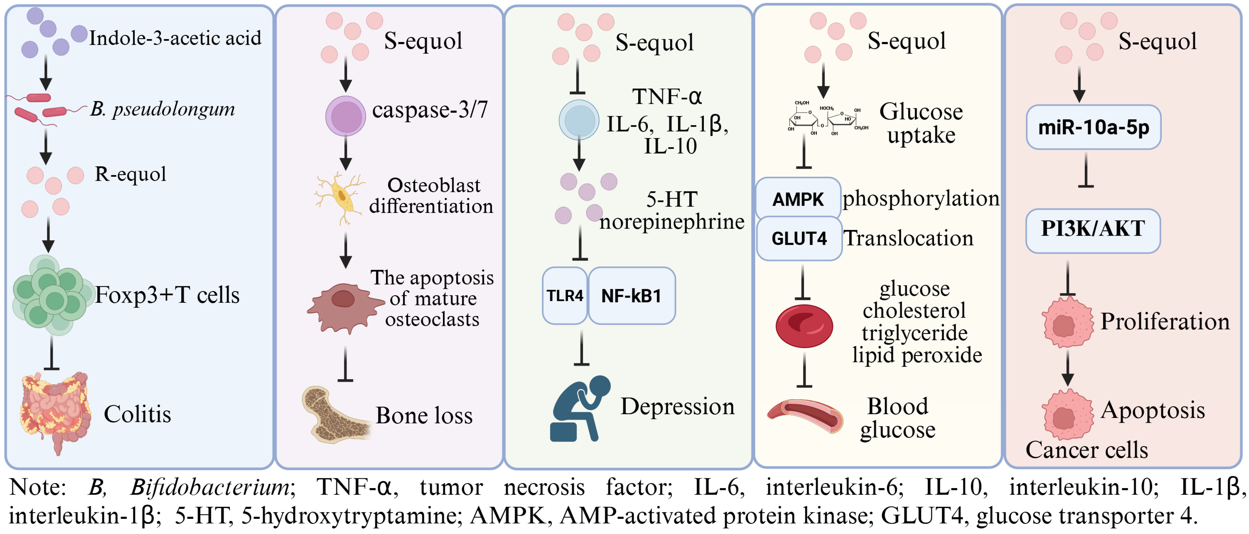 - Gong, Y.; Lv, J.; Pang, X.; Zhang, S.; Zhang, G.; Liu, L.; Wang, Y.; Li, C. Advances in the metabolic mechanism and functional characteristics of equol. Foods 2023, 12, 2334. [Google Scholar] [CrossRef] [PubMed]