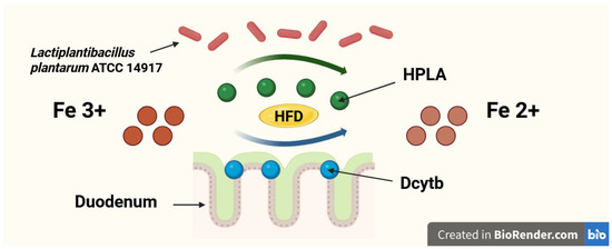 In our study we hypothesise that in conditions of a high-fat iron-deficient diet, probiotic bacteria Lactiplantibacillus plantarum ATCC 14917 produces HPLA in the duodenum. In our previous studies on such dietary conditions, we demonstrated that Lactiplantibacillus plantarum is able to exert a significant influence on Fe [23,24,25]. In this study, we further investigated the selected potential mechanisms underlying the effects observed so far.