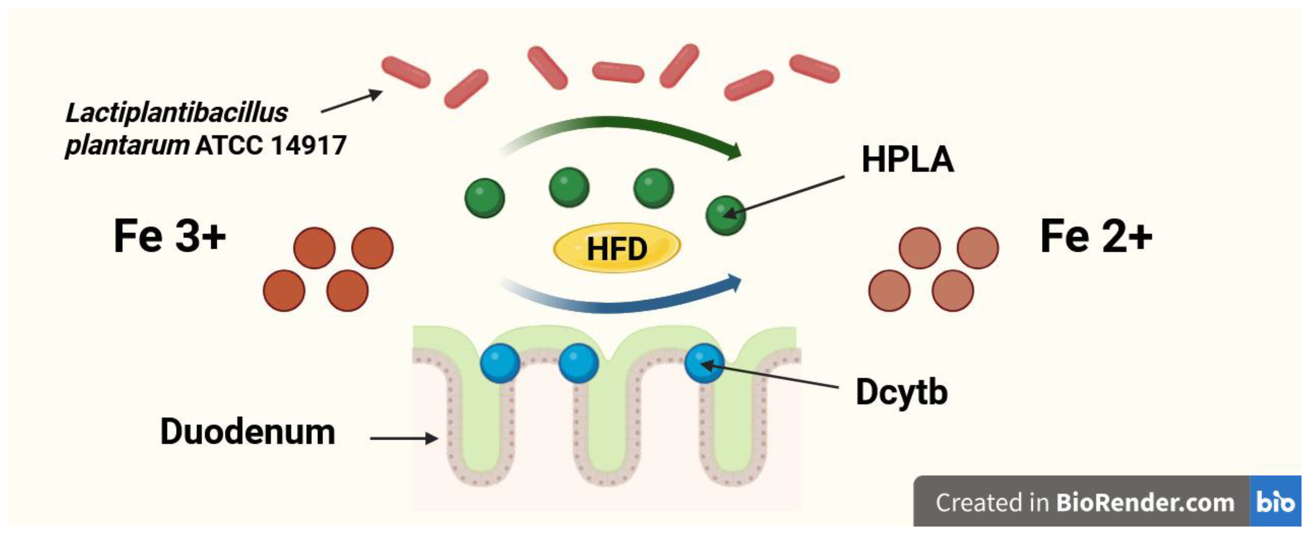 Skrypnik, K.; Olejnik-Schmidt, A.; Schmidt, M.; Selvan, D.; Suliburska, J. Lactiplantibacillus plantarum, Duodenal Hydroxyphenyllactic Acid and Iron: Insights from a Rat Model of a High-Fat Iron-Deficient Diet. Nutrients 2025, 17, 3454. https://doi.org/10.3390/nu17213454