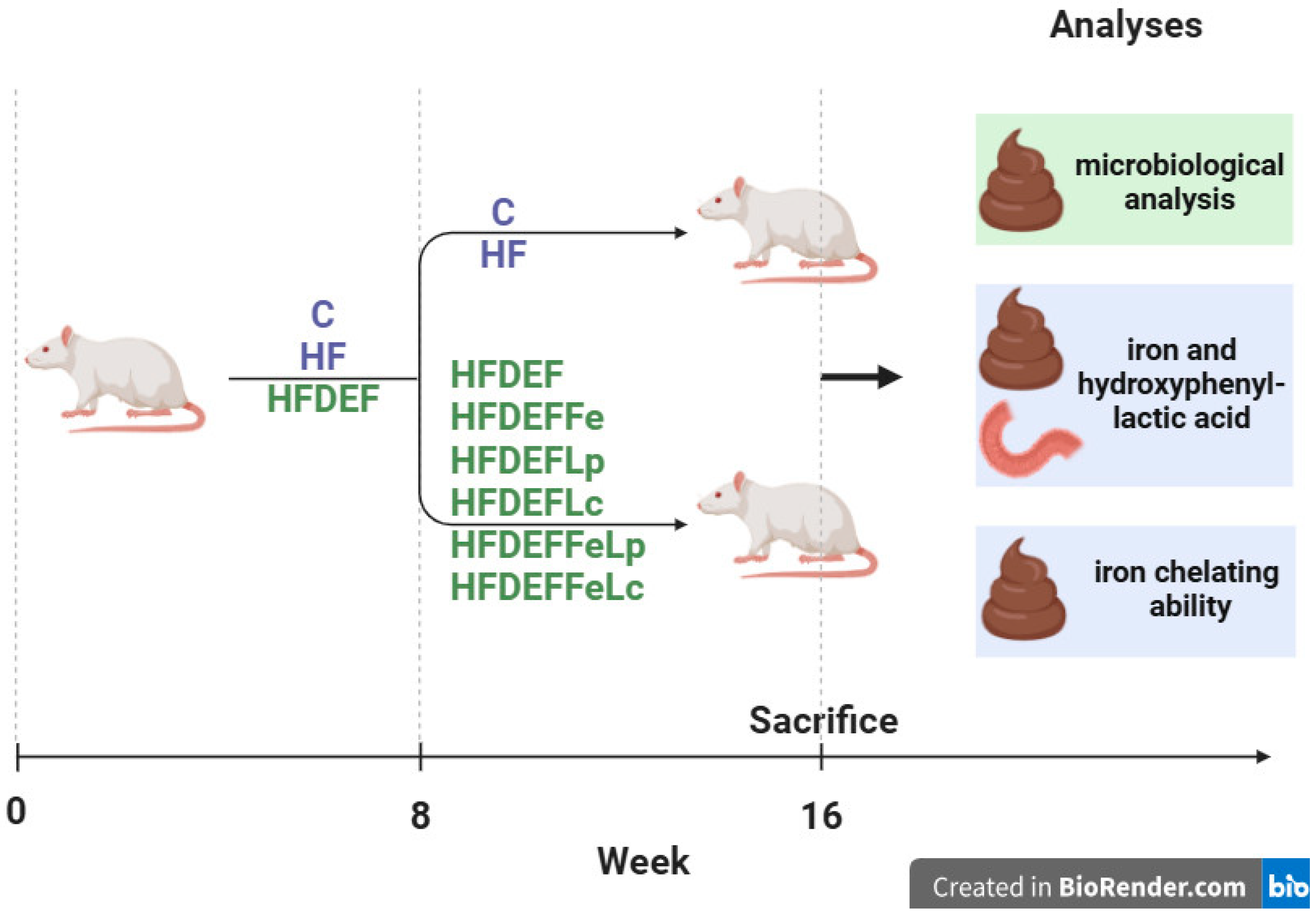 - HFDEFLc subgroup: Fed a high-fat, Fe-deficient diet with the probiotic Latilactobacillus curvatus (daily dose: 5 × 109 CFU).