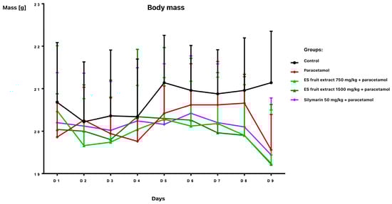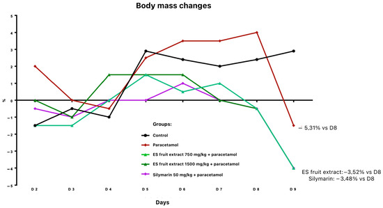 Twenty-four hours after paracetamol administration, a body weight reduction was noted: 3.5% in groups pre-treated with fruit extract or silymarin, and 5.3% in the paracetamol-only group (relative to day 8) (Figure 2). All paracetamol-treated animals exhibited ruffled fur.