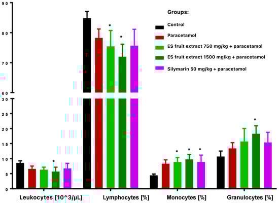 The most interesting results concern platelet parameters. The overdose of the paracetamol caused a significant reduction in platelet count. This was accompanied by an increase in platelet anisocytosis (PDW) and mean platelet volume (MPV) with a decrease in platelet permeability (PCT). This finding suggests increased platelet destruction or consumption (e.g., via microthrombi in the damaged liver) and simultaneous compensatory production of young, larger platelets by the bone marrow. Importantly, in the group protected with the lower dose of ES extract (750 mg/kg), no significant decrease in platelet count was observed, whereas with the high dose of ES extract (1500 mg/kg), thrombocytopenia was evident and similar to that in the paracetamol group. This indicates that the lower dose of the extract could protect megakaryocytes or inhibit platelet destruction (e.g., by limiting liver endothelial damage and microthrombi formation), whereas the higher dose did not produce this effect. Moreover, thrombocytopenia was even more pronounced in the high-dose ES group. It is possible that the surplus of some compounds in the high-dose ES had an adverse effect on platelet function or the coagulation system.