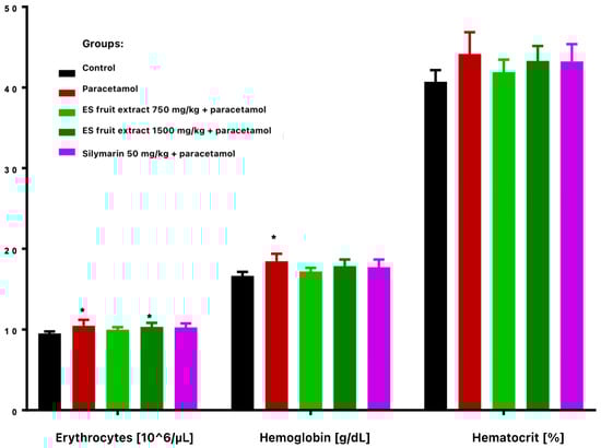 Red blood cells parameters: erythrocytes [106/µL], hemoglobin [g/dL], hematocrit [%]. * p < 0.05 nonparametric Kruskal–Wallis test, comparison vs. control.