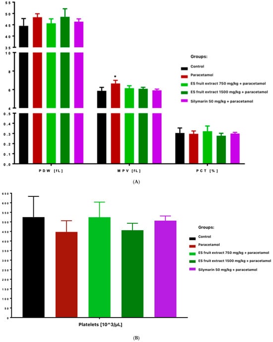 Platelet count decreased in paracetamol and high-dose ES fruit extract (1500 mg/kg) groups, accompanied by increased platelet anisocytosis (PDW) and mean platelet volume (MPV), and reduced plateletcrit (PCT) (Figure 5). Those results correspond to an acute stress and inflammatory reaction-paracetamol, especially in high doses, may cause the displacement of leukocytes (especially lymphocytes) into damaged tissues and the mobilization of neutrophils. In other words, the adaptogen did not prevent the decrease in leukocytes after paracetamol and even seemed to enhance it (these differences were statistically significant compared to the control group).