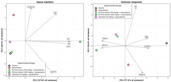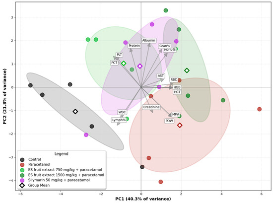 The Principal Component Analysis (PCA) of the experimental groups, based on biochemical and hematological parameters, illustrates the relationships among them (Figure 7). A clear separation is evident on the biplot between the control group (left side) and the paracetamol-only group (right side), along the PC1 axis. This axis accounts for the largest proportion of the data variance (40.3%) and can be interpreted as the axis of paracetamol-induced injury. The second principal component (PC2) explains 21.8% of the data variance. The position of the paracetamol group is associated with the vectors for variables such as creatinine and AST, as well as platelet parameters indicative of an inflammatory state (MPV, PDW), which graphically confirms the multi-organ toxicity of paracetamol. The group treated with the E. senticosus extract at a dose of 750 mg/kg (+paracetamol) is shifted towards the control group, and its group mean is located in close proximity to the mean of the reference silymarin group. The position of the ES fruit extract 750 mg/kg + paracetamol group between the Control and Paracetamol groups along the PC1 axis suggests that the lower extract dose partially mitigates the negative effects of paracetamol. Furthermore, this group’s confidence ellipse overlaps with that of the Silymarin 50 mg/kg + paracetamol group, suggesting that the overall effect of the 750 mg/kg ES fruit extract is similar to that of silymarin. The position of the ES fruit extract 1500 mg/kg + paracetamol group confirms that the higher dose of the extract did not exhibit a protective effect and, in fact, may have intensified the negative effects.