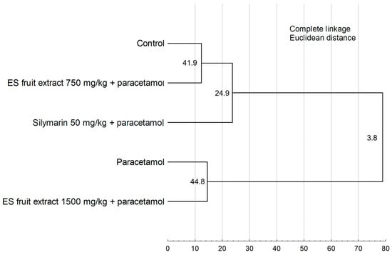The results of the Hierarchical Cluster Analysis (Figure 8) confirm the findings from the PCA, revealing two main, distinctly separated clusters. One cluster group, the control group, the group treated with the 750 mg/kg ES extract, and the silymarin group. The second cluster consists of the paracetamol-only group and the group treated with the higher 1500 mg/kg ES extract dose. The close similarity between these latter two groups demonstrates that the 1500 mg/kg dose failed to provide a protective effect.