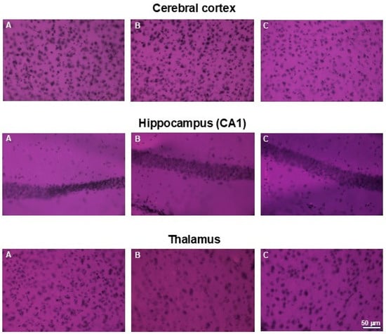 H&E staining of brains. Microphotographs of representative brain sections obtained from control mouse (A) and animals treated with 750 (B) or with 1500 mg/kg b.w. of the intractum (C). Upper panel shows cerebral cortex, middle and bottom panels show selected subcortical structures: CA1 region of hippocampus and thalamus (respectively). Note the proper cell arrangement and morphology within all the sections. Magnification: 400×, bar 50 mm.