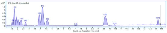 Base peak chromatogram obtained in positive ionization mode of E. senticosus fruit extract analyzed for amino acid content. Identified compounds are listed in Table 1.