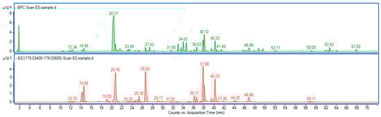 Base peak chromatogram (green line) of Eleutherococcus senticosus fruit extract, along with the extracted ion chromatogram (red line), showing a mass range corresponding to caffeic acid (C9H8O4) a ppm error of −5.46 to 5.65. Identified compounds are listed in Table S1.