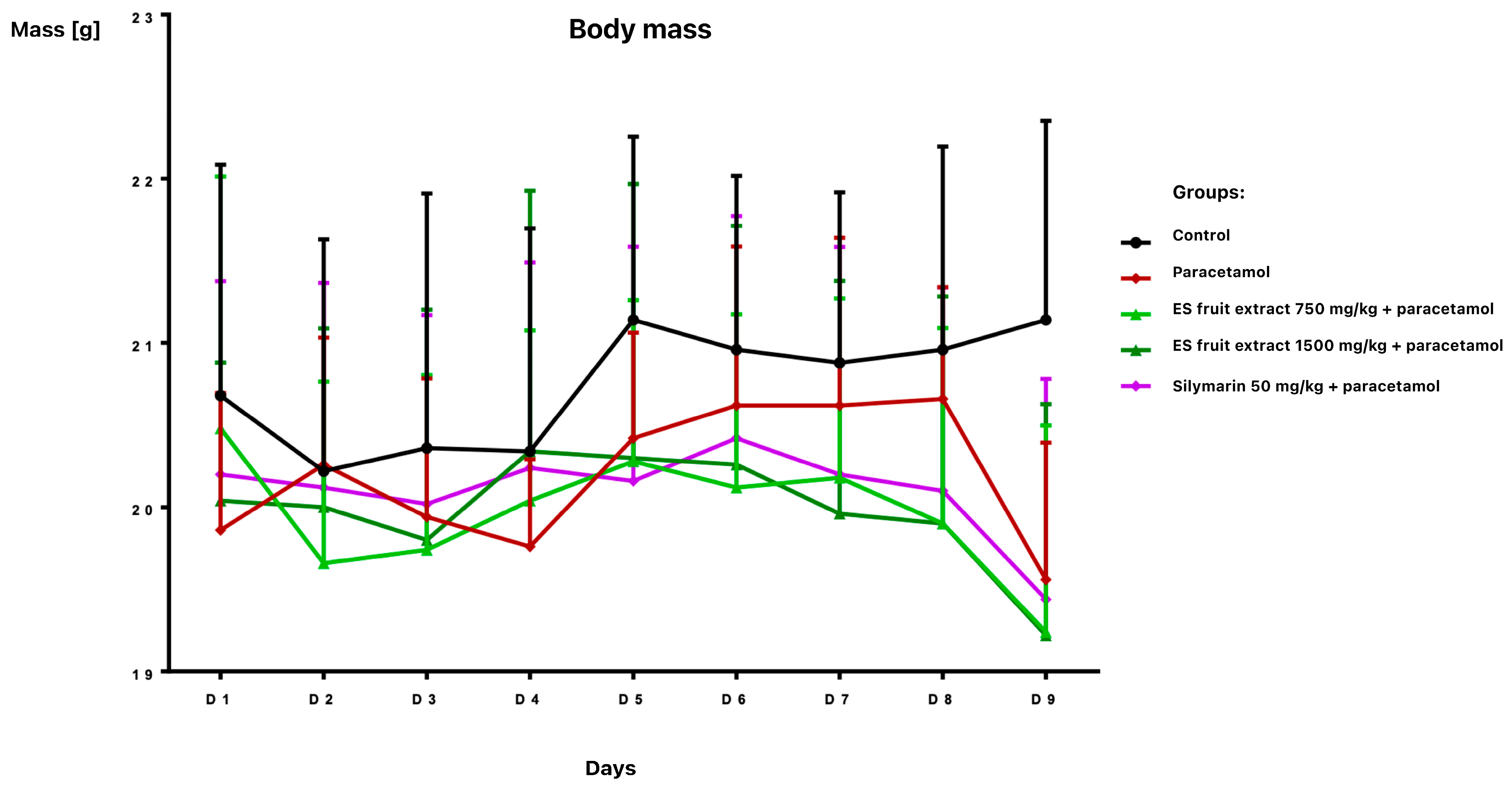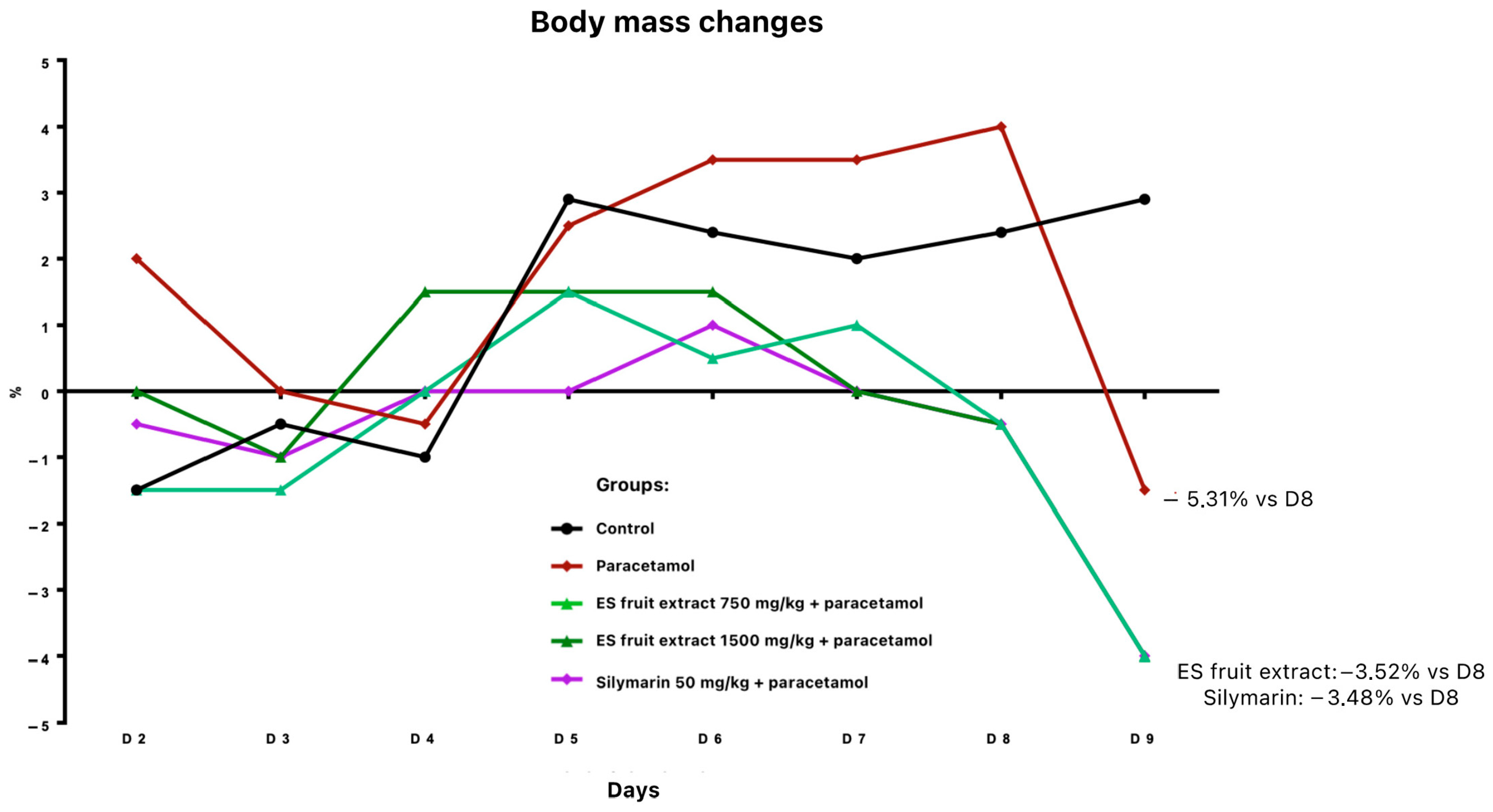 - Group 5: Silymarin (50 mg/kg, PO, twice daily for 7 days and once on day 8) + paracetamol (300 mg/kg, IP, day 8).