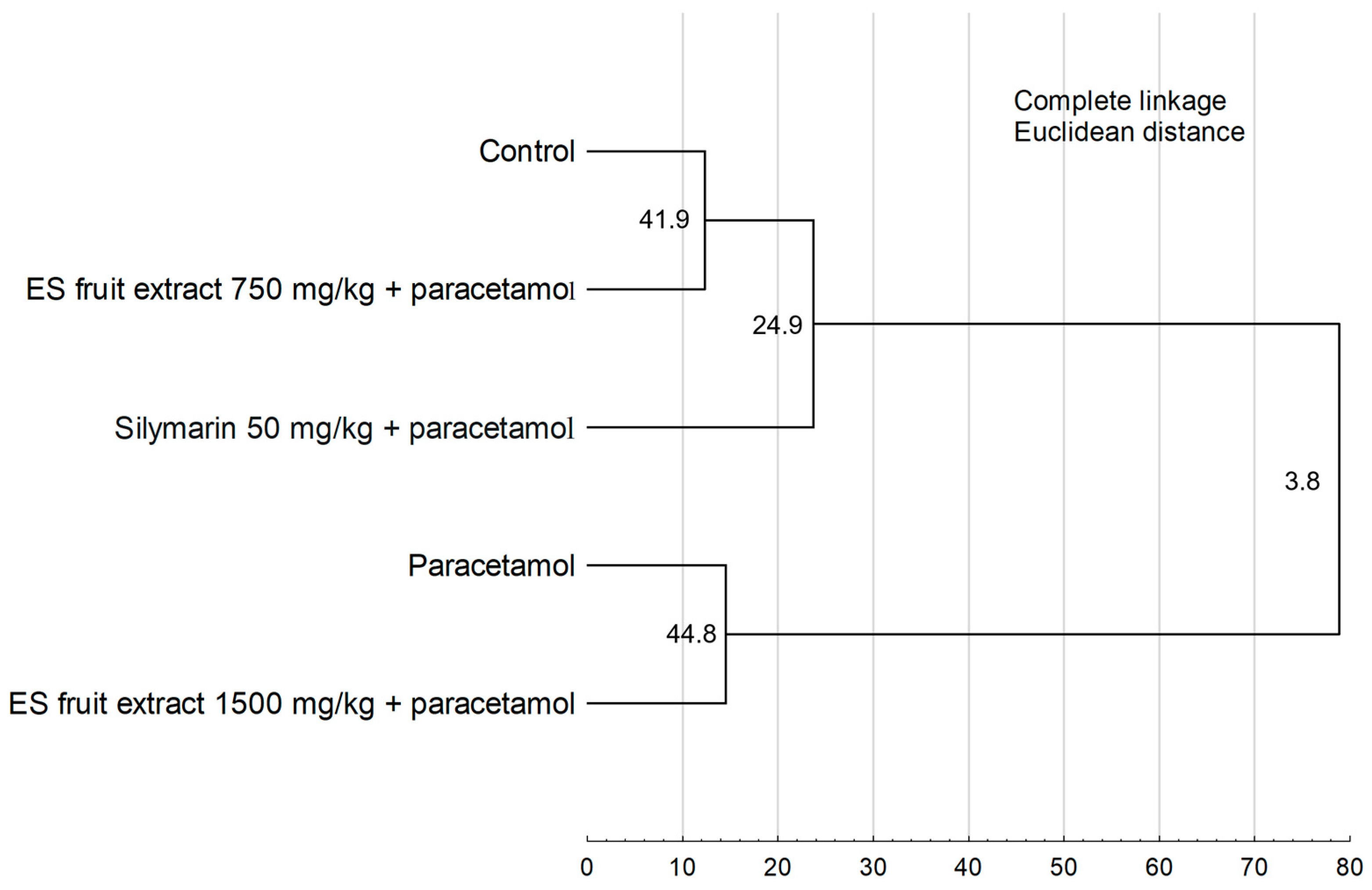 | 3. ES fruit extract 750 mg/kg + paracetamol | 4.20 | 1.3 | 0.41 | 0.74 | 2.27 |