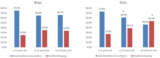 Breakfast consumption/skipping by age group and gender. * p < 0.001 for differences in breakfast consumption/skipping between the age categories, in girls.