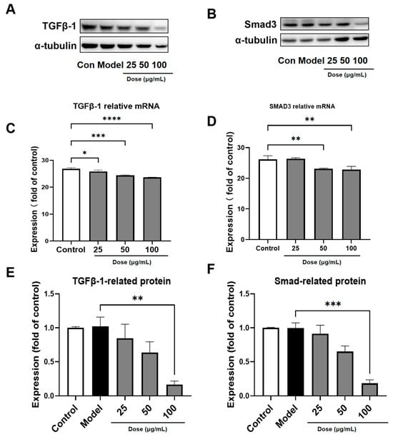 The TGF-β1/Smad3 signaling pathway plays a central role in the progression of liver fibrosis. TGF-β1 acts as a key profibrotic cytokine, promoting extracellular matrix deposition and hepatic stellate cell activation, while Smad3 functions as a downstream effector that transduces TGF-β1 signals from the cell membrane to the nucleus via phosphorylation [,]. In this study, we found that treatment with PACs-CFE significantly downregulated the expression of both TGF-β1 and Smad3 at the protein and mRNA levels (Figure 5). These findings suggest that PACs-CFE may exert its antifibrotic effects by suppressing the TGF-β1/Smad3 signaling pathway, thereby inhibiting fibrogenic gene expression and hepatic stellate cell activation.