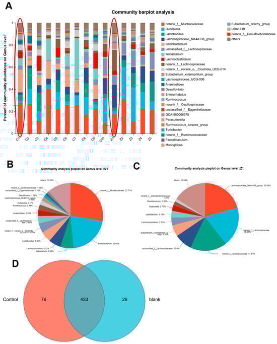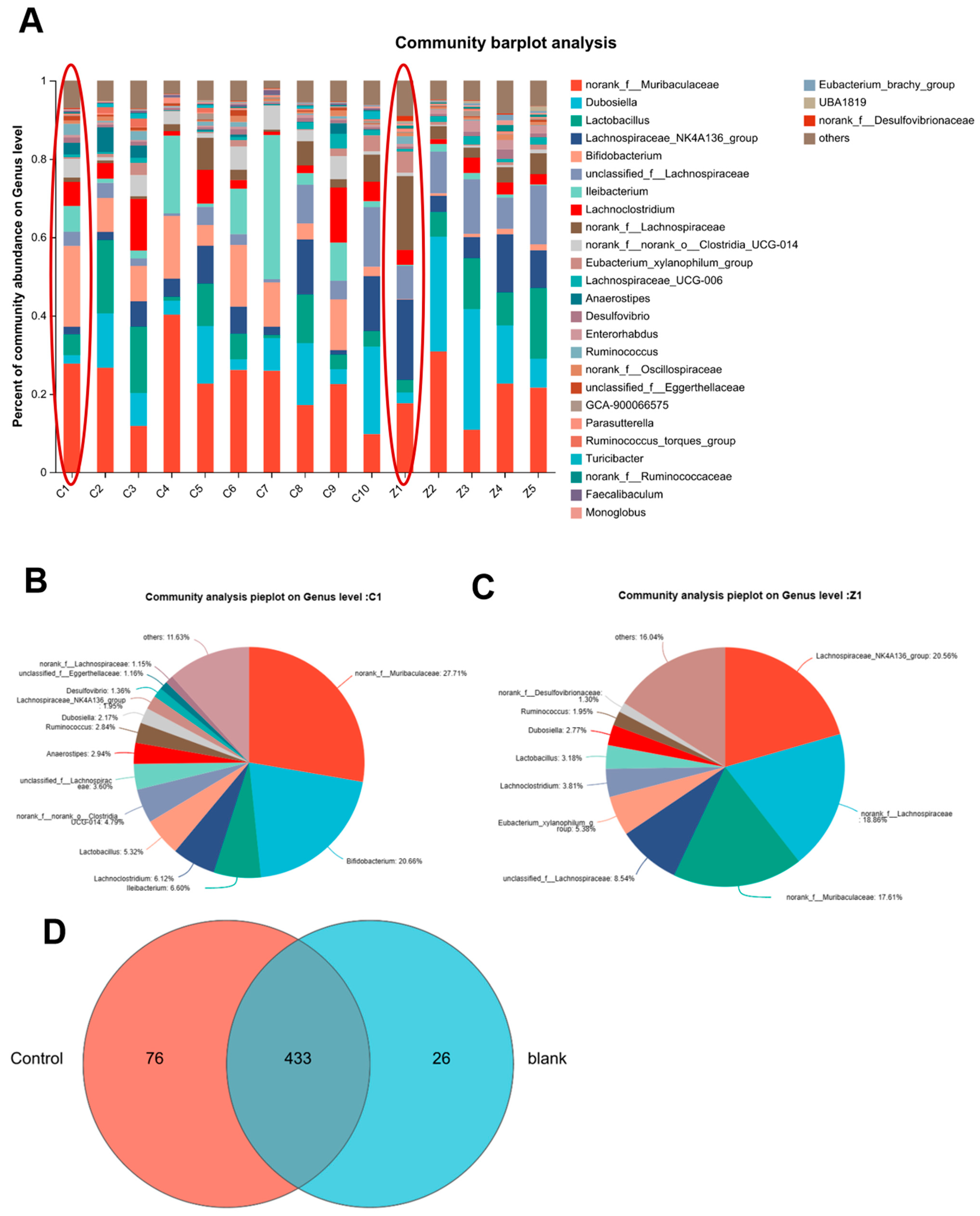 Analysis of intestinal flora in liver fibrosis mice after administration of PACS-CFE. Sample community composition analysis (A), species relative abundance histogram ((B) is the C1 group within the red circle in (A). (C) is the Z1 group within the red circle in (A)), species relative abundance pie charts (D) species Venn analysis plot. For (A–D), data were collected in CCl4-induced hepatic fibrosis mice treated with 400 mg/kg PACs-CFE for 6 weeks.