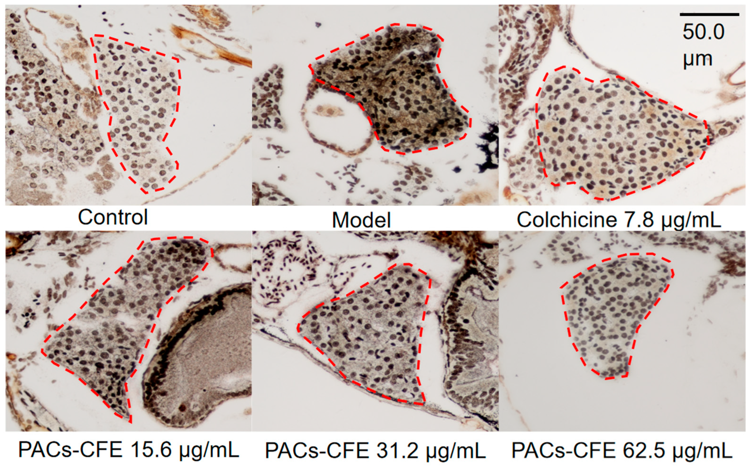 Alterations in the structure of reticular fiber, as the primary scaffolding for hepatocytes and hepatic sinusoids, reflect pathological changes in the liver. Under reticulofiber staining, reticular fibers appeared black, collagen fibers were yellow to yellowish-brown, and cell nuclei were brown to blackish-brown. As shown in Figure 2, the control group displayed normal liver architecture, with clearly defined hepatocyte nuclei arranged in neat rows without observable reticular or collagen fibers. In contrast, the model group exhibited disorganized liver structure, vacuolar degeneration, disordered nuclear arrangement, and a marked increase in reticular and collagen fibers. These characteristics suggest that TAA induced significant fibrotic remodeling in zebrafish. In the positive control group treated with colchicine, liver morphology resembled that of the control group, with clear hepatocyte nuclei and minimal fibrotic fiber deposition. Similarly, treatment with PACs-CFE at 31.2 µg/mL preserved normal liver architecture, showing clearly defined nuclei, absence of vacuolar degeneration, no detectable reticular fibers, and a marked reduction in collagen fibers. These findings suggest that PACs-CFE alleviated liver fibrosis in zebrafish, restoring normal hepatic architecture and reducing fibrotic tissue accumulation.