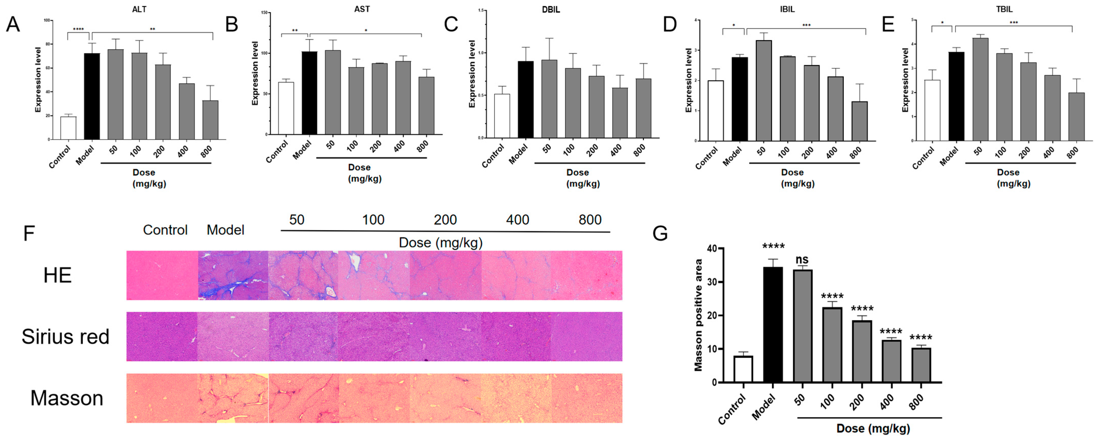 PACs-CFE alleviates the disease process in CCl4-induced hepatic fibrosis mice. (A–E) Effect of indicated concentrations of PACs-CFE on ALT, AST, DBIL, IBIL, and TBIL levels in carbon CCl4-induced mice after 6 weeks of treatment; (F). Liver tissue alterations after 6 weeks of treatment of CCl4-induced liver fibrosis in mice with indicated concentrations of PACs-CFE; (G) Effect of indicated concentrations of PACs-CFE on Masson-positive area in CCl4-induced mice after 6 weeks of treatment. For (A–E,G), the data presented are means  ±  S.D. Statistical significance was determined by Student’s t-test (ns: not statistically significant, * p < 0.05, ** p < 0.01, *** p < 0.001, **** p < 0.0001, n = 8).