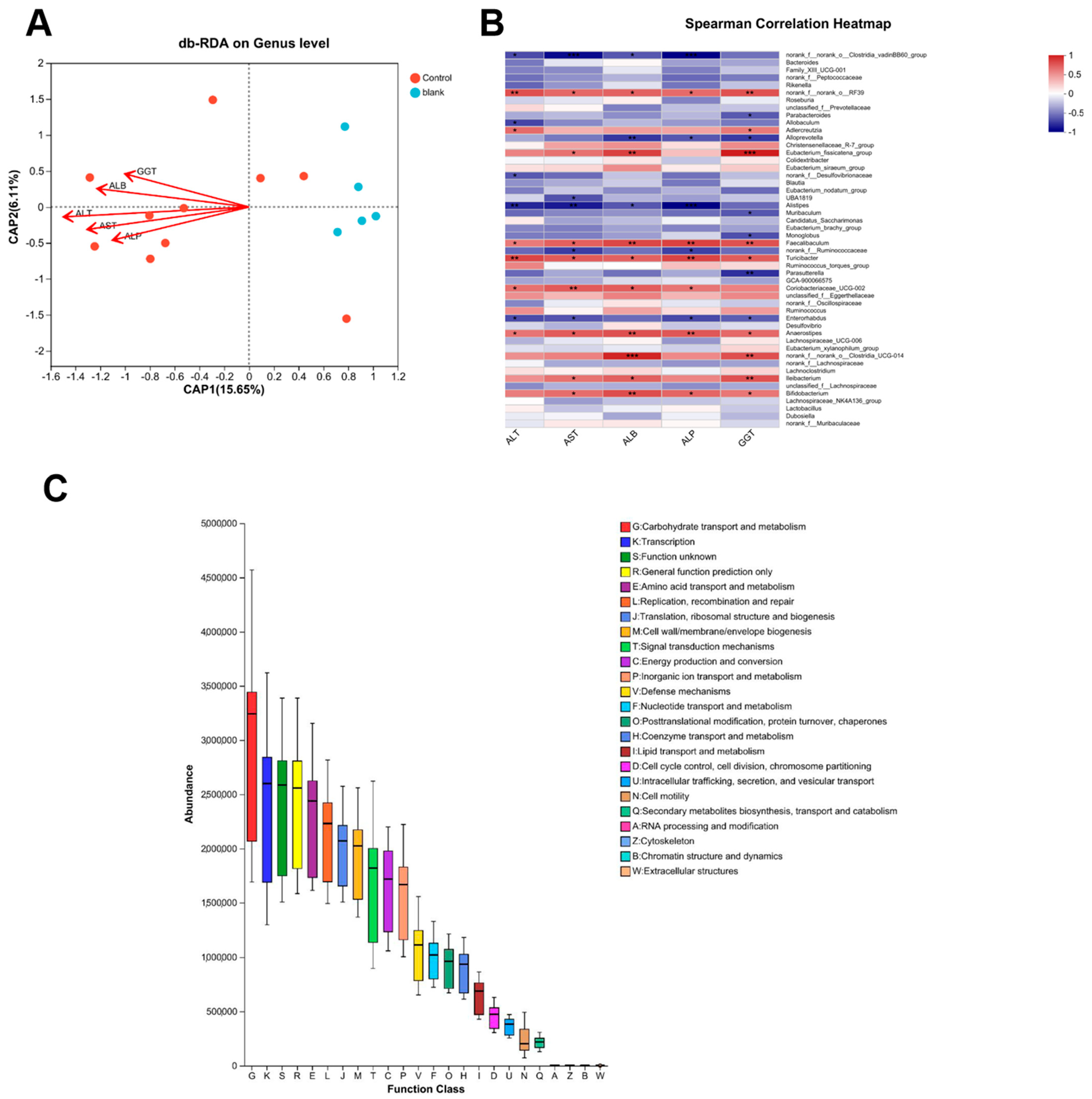 Functional Prediction of Gut Microbiota and Its Association with Anti-Fibrotic Mechanisms. (A) flora versus db-RDA clinical factors; (B) Heatmap analysis of correlation between flora and clinical factors; (C) COG functional enrichment. For (A–C), data were collected in CCl4-induced hepatic fibrosis mice treated with 400 mg/kg PACs-CFE for 6 weeks. (* p < 0.05, ** p < 0.01, *** p < 0.001, n = 8).