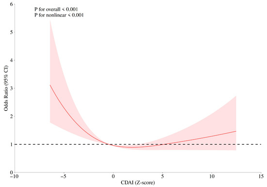 Restricted cubic spline (RCS) plots for the correlations between CDAI and gastric cancer risk.