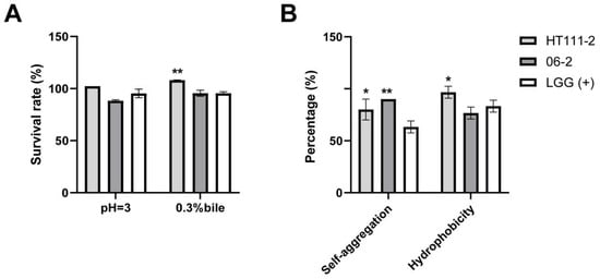 Probiotic properties of L. xujianguonis strains HT111-2 and 06-2. (A) Survival ability in gastrointestinal tract, including acid and 0.3% bile salt tolerance. (B) Colonization capacity in the intestine. Values represent mean ± standard error; LGG: Lactobacillus rhamnosus. *: p < 0.05, **: p < 0.01. number of biological replicates = 3.