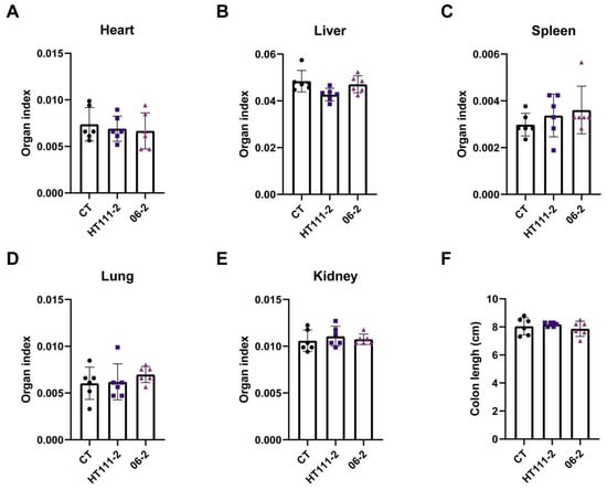 Effects of L. xujianguonis strains on organs in the acute toxicity study. (A–E) Organ index of heart, liver, spleen, lung, and kidney; (F) Colon length of mice; Each of the solid round, square and triangle symbols represent a mouse in treatment groups, CT, HT111-2 and 06-2 respectively. Number of mice per group = 6.