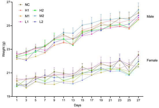 Body weight of mice in the subacute toxicity study. Number of mice per group = 6 for each gender. NC: negative control, H1: high-dose L. xujianguonis HT111-2 gavage, H2: high-dose L. xujianguonis 06-2 gavage, M1: middle-dose L. xujianguonis HT111-2 gavage, M2: middle-dose L. xujianguonis 06-2 gavage, L1: low-dose L. xujianguonis HT111-2 gavage, L2: low-dose L. xujianguonis 06-2 gavage.