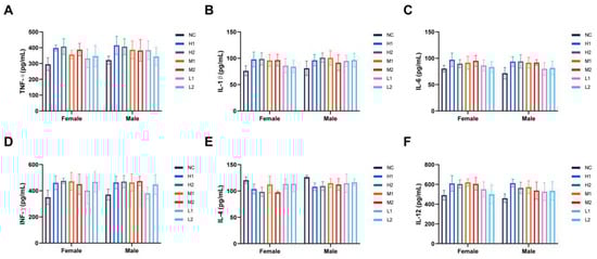 Effects on inflammatory and immune factors after L. xujianguonis intervention in the subacute toxicity study. (A–F) Levels of cytokines, TNF-α, IL-1β, IL-6, INF-γ, IL-4, and IL-12, in mouse serum. NC: negative control, H1: high-dose L. xujianguonis HT111-2 gavage, H2: high-dose L. xujianguonis 06-2 gavage, M1: middle-dose L. xujianguonis HT111-2 gavage, M2: middle-dose L. xujianguonis 06-2 gavage, L1: low-dose L. xujianguonis HT111-2 gavage, L2: low-dose L. xujianguonis 06-2 gavage. number of mice per group = 6 for each gender.