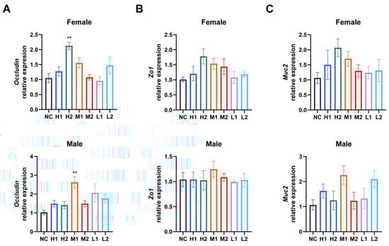 Relative mRNA expression of genes associated with intestinal epithelial barrier functions, including Occludin (A), Zo1 (B), Muc2 (C). **: p < 0.01. NC: negative control, H1: high-dose L. xujianguonis HT111-2 gavage, H2: high-dose L. xujianguonis 06-2 gavage, M1: middle-dose L. xujianguonis HT111-2 gavage, M2: middle-dose L. xujianguonis 06-2 gavage, L1: low-dose L. xujianguonis HT111-2 gavage, L2: low-dose L. xujianguonis 06-2 gavage. Number of mice per group = 6 for each gender.