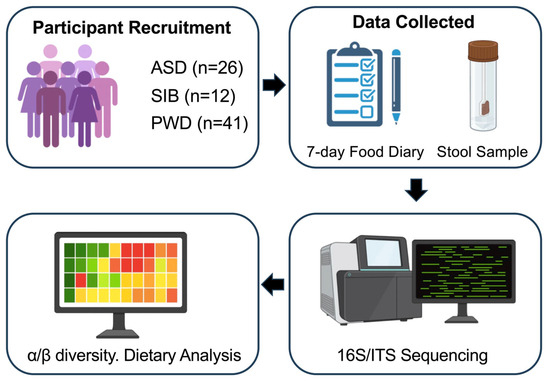 We performed bacteriome and mycobiome analysis on fecal samples collected from a group of 26 children (between 5 and 17 years of age) recruited for this study, including 17 confirmed with an ASD diagnosis and 9 siblings without diagnosis (“SIB”). A total of 27 first-degree family members (parents) without a diagnosis (“PWD”) also participated to this study. Parental samples were included as a within-family reference to contextualize microbial variation, but all primary analyses comparing children with ASD versus siblings were conducted independently of parental data due to differences in age and dietary habits. All subjects participating to this study were exclusively recruited from the Il Cireneo SRL institution (ICS, Vasto, Chieti, Italy) (IRB #: STUDY20230683). The ICS stool samples were collected following a specific protocol and were processed by the same biotechnology company (CosmosID Inc., Germantown, MD, USA) specialized in processing fecal human samples for microbiome analysis. As reported in the literature, studies focused on ASD commonly exhibit sex bias [16,17], so we calculated the percentage of male subjects in each cohort, together with mean age and dietary principal components (PC) obtained from percent energy dietary data subject to centered Log-Ratio transformation (Table 1). Informed consent was obtained from each member participating in the study with an official consent document distributed via hardcopy. Dietary information was also collected using a food diary questionnaire in which participants recorded all foods consumed during seven consecutive days. In addition to dietary intake, the questionnaire obtained data on participants’ sex, age, and reported medication consumption. Identifiable data comprising the participant’s name, email, and telephone number, were collected solely for contact purposes. Completed questionnaires were de-identified upon receipt. The collected data were utilized to characterize the gut microbiome composition, comprising bacteriome and mycobiome, of the participants. The overall study design is illustrated in Figure 1.